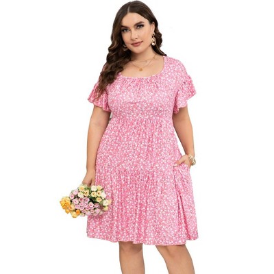 LXT- Women's Plus Size Square Neck Ruffle Sleeve Flowy Floral Summer Midi Dress with Pockets