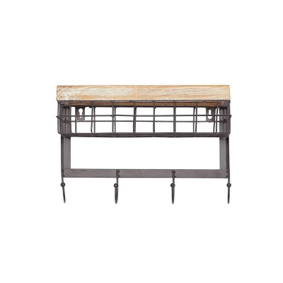 9"x13" Metal 1 Shelf and 4 Hanger Wall Hook Brown - Olivia & May: Rustic Farmhouse Iron Storage
