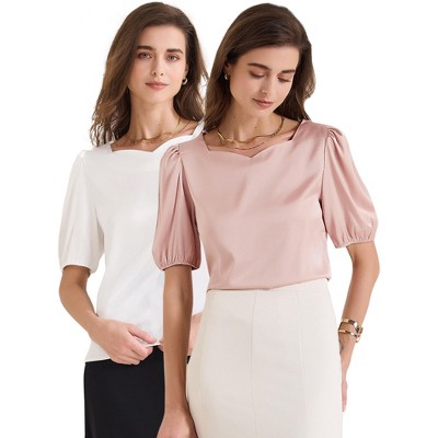 BLUEMING Womens T-Shirts Short Puff Sleeve Casual Blouses V Neck Smocked Cuff Tunic Tops Business Tops