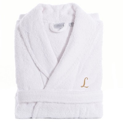 Linum Home Textiles 100% Turkish Cotton Unisex Personalized Terry Bathrobe White in Gold Script Font