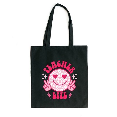 City Creek Prints Teacher Life Leopard Smiley Face Canvas Tote Bag - 15x16 - Black