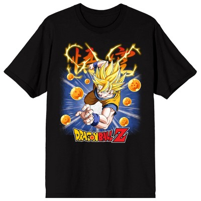 Dragon Ball Z Super Saiyan Goku, Seven Dragon Balls, Kanji Text with Aura, Logo, Speeding Background on Black Short Sleeve Adult T-Shirt