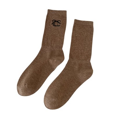Anna-Kaci Women's 3-Pair Minimalist Crew Socks with Embroidered Bow Detail Soft Knit Everyday Comfort Sock Set - Coffee