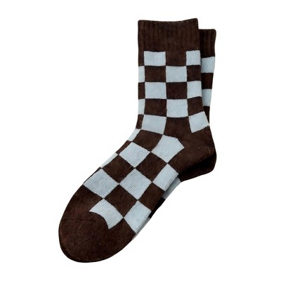 Anna-Kaci Women's 3-Pair Checkerboard Crew Socks Soft Knit Fabric Ribbed Cuff Comfortable Everyday Giftable Sock Set - Blue+Brown