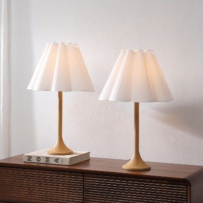 JONATHAN Y Abel 25.5" Modern Coastal Pleated Shade Faux Wood Column LED Table Lamp, Brown Wood Finish (Set of 2)
