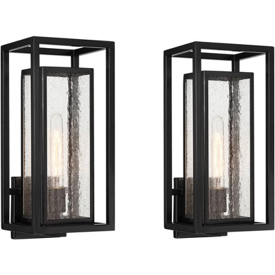 Possini Euro Design Woodley 13" High Modern Outdoor Wall Light Fixture Mount Porch House Set of 2 Weatherproof Sand Black Aluminum Seeded Glass Shade
