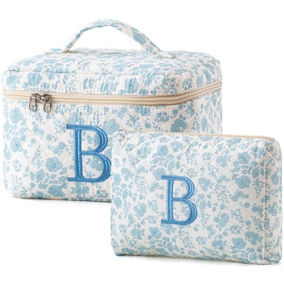 Narwey Initial Quilted Makeup Bag, Cotton Large Travel Makeup Bag, Cute Floral Coquette Make up Bag Cosmetic Bag Toiletry Bag for Women Girls B
