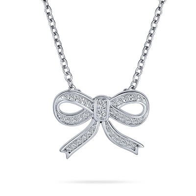 Bling Jewelry Dainty Cubic Zirconia Pave CZ Station Ribbon Bow Pendant Necklace Sterling Silver