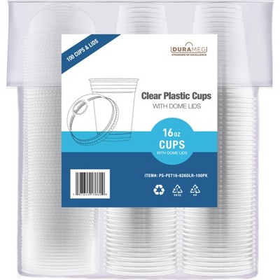 Durameg Large Party Plastic Cups with Dome Lids 16 oz 100 Count - Crystal Clear Disposable Cups