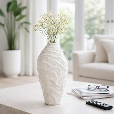 Textured Abstract Ceramic Flower Vase for Shelves and Centerpieces - Tall Vase Accent for Table Display and Home Decor - White, 12"