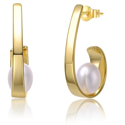 Guili Sterling Silver 14K Yellow Gold Plated Earrings with White Freshwater Pearl, Featuring Ribbon Half-Hoop Drop Design for Elegance
