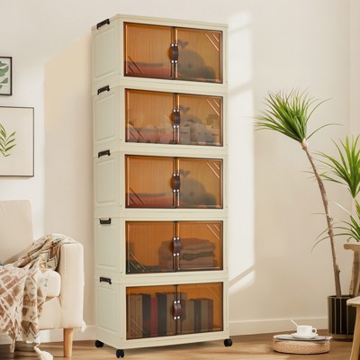 Stackable Storage Bins, Foldable Storage Bins, Plastic Storage Box with Doors & Lockable Wheels, Closet Organizer for Home, Pantry, Office