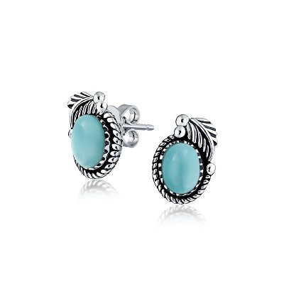 Bling Jewelry Native American Style Natural Larimar Round Bezel Leaf Rope Edged Stud Earrings Western Jewelry Oxidized .925 Sterling Silver