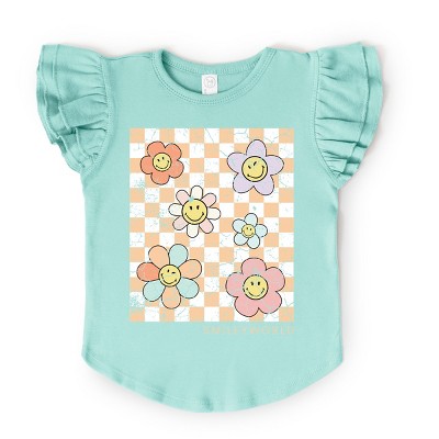The Juniper Shop SmileyWorld Checkered Floral Distressed Flutter Sleeve Tee