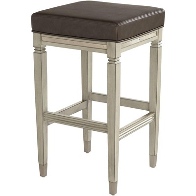 55 Downing Street Jaxon Wood Bar Stool Gunpowder 31" High Farmhouse Rustic Vintage Gray Faux Leather Footrest for Kitchen Counter Height Island