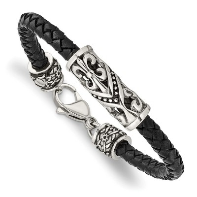 Chisel Stainless Steel Antiqued and Textured Fleur de Lis Black Braided Leather 8.5" Bracelet