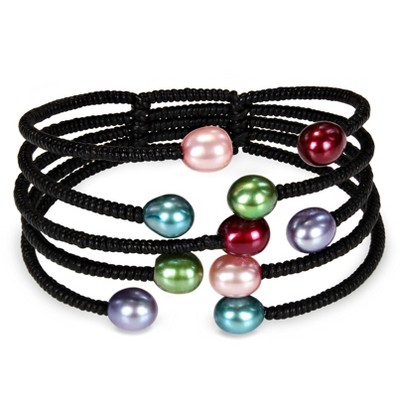 EVERLY JEWELRY | 7-7.5mm Multi-Color Cultured Freshwater Rice Pearl Bypass Leather Wire Bangle - 7 in