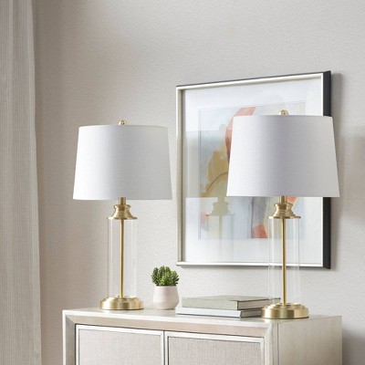 (2 Sets) 5" W x 17" 3-Way Dimmable Touch Control White-Gold Metal BaseTable Lamps with Linen Shades(LED Bulbs Included)