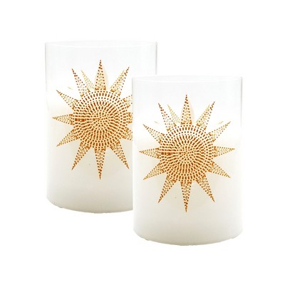LumaBase Battery-Operated LED Glass Candles with Flickering Flame, Mosaic Sun - Set of 2