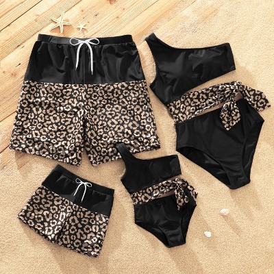 PATPAT Family Matching Leopard Print Swimsuits One Shoulder Cutout Colorblock One Piece Swimwear Swim Trunks Shorts