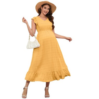 Coolmee Women Summer Maternity Maxi Dress Casual V Neck Ruffle Sleeve Tiered A Line Flowy Long Sundress with Pockets