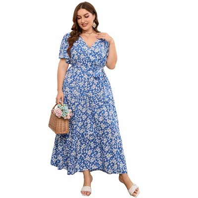 Women's Plus Size Maxi Dress Square Neck Short Sleeve Smocked Flowy Boho Floral Print Casual Summer Wedding Party Dresses