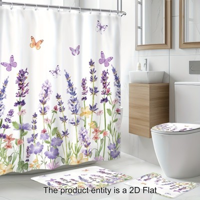 Nertpow 4PCS Lavender & Butterfly Bathroom 4 Piece Set, Elegant Print Shower Curtain, Soft Absorbent Bath Mats for Bathroom.