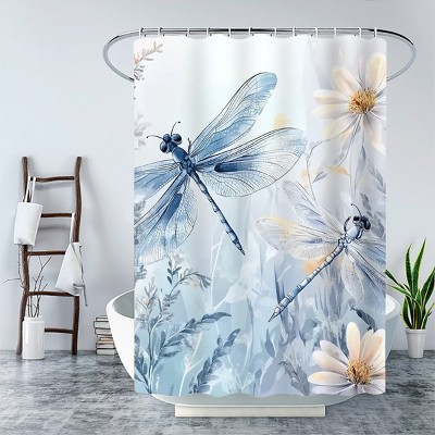 Nertpow 4PCS Blue Artistic Themed Dragonfly & Daisy Print Shower Curtain, With Durable Shower Curtain and Non-Slip Floor Mats.