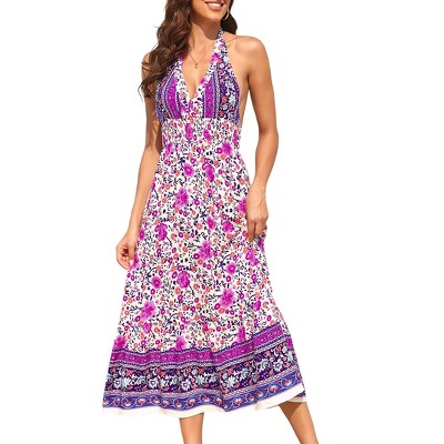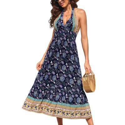Women's Summer Fashion Floral Halter High Waist Dress V-Neck Wrap Bohemian Dress Sleeveless A Line Flowy Beach Casual Maxi