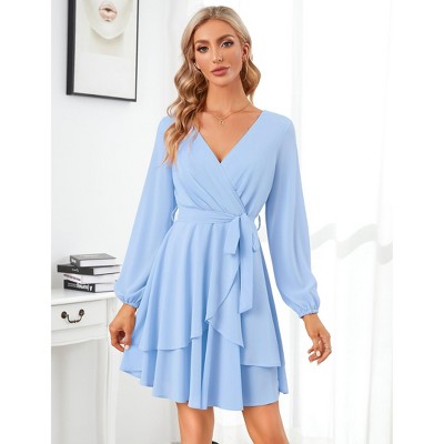 BLUEMING Womens Casual Dress V Neck Wrap Dress Lantern Sleeve Tie Wasit Petal Hem Dress Back Zipper Midi Dress