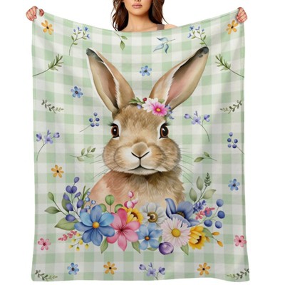Easter Throw Blanket Bunny Blankets and Throws, Floral Bunny Blanket for Couch Bed Sofa Dorm, Soft Cozy Flannel Green Buffalo Plaid Blanket 50x60 in