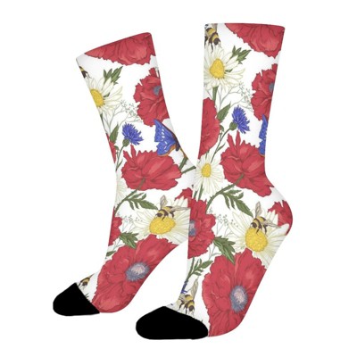 Blooming Red Poppies And Bumblebee Bees Women Printed Crew Socks Funny Funky Socks Soft Polyester Novelty Gifts for Artists Men