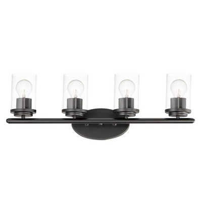 DORESshop 28 in. 4 Light Matte Black Industrial Modern Cylinder Vanity Light for Bathroom with Clear Glass Shades