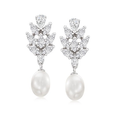 Ross-Simons Cultured Pearl and 50 ct. t.w. CZ Hoop Drop Earrings in Sterling Silver