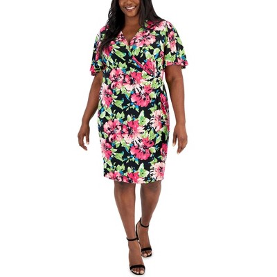 24seven Comfort Apparel Plus Size Brown and Pink Print Short Sleeve Tie Waist Midi Dress