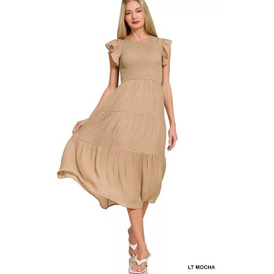 Zenana Woven Smocked Ruffle Sleeve Midi Dress