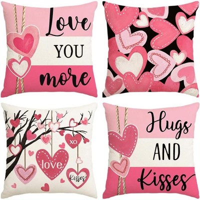 Lomsoe 4pcs Linen Pink Throw Pillow Covers Heart Stripes Hugs and Kisses Love You More Cushion Case Decorations for Couch.