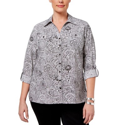 NY Collection Womens Roll Tab Sleeve Burnout Knit Top Button Up Shirt