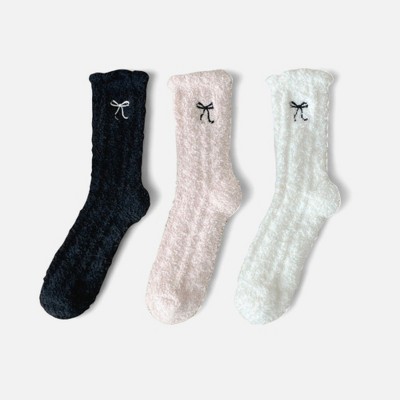 Anna-Kaci Women's 3-Pack Fuzzy Crew Socks with Embroidered Bow Detail Soft Cozy Lounge Sock Set