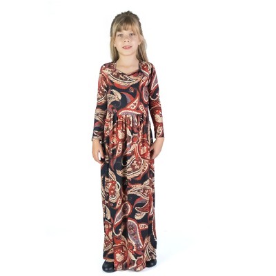 24seven Comfort Apparel Brown Fall Print Girls Long Sleeve Side Slit Maxi Dress