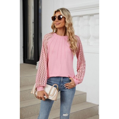 Womens Tops Round Neck Long Sleeve Lace Trim Relaxed Fit T Shirt Pink M