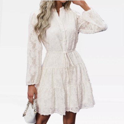 Womens Long Sleeve Lace Dress Button Down Tiered A Line Dress Tie Waist Mini Shirts Dress Fall Casual Dress