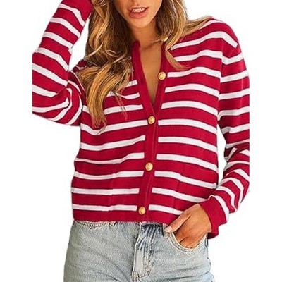 Women's Striped Button Cardigan Open Front Color Block Knit Sweater with Pockets