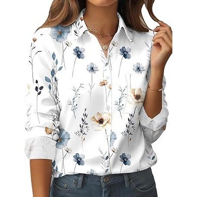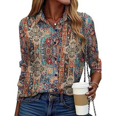 Coolmee Women's Floral Blouses Dressy Casual V Neck Shirts Lantern Long Sleeve Boho Chiffon Fall Tops