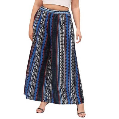 Women's Plus Size Summer Casual Striped Wide Leg Pants Elastic Waist Bohemian Palazzo Pants Work Trousers with Pockets