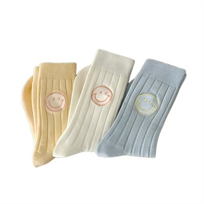 Anna-Kaci Women's Ribbed Knit Crew Socks 3 Pair Set with Smiley Face Embroidery and Soft Stretch Comfort - Multicolors