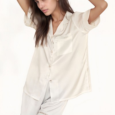 Anna-Kaci Lounge Women's Satin Pajama Set with Lace Trim Short Sleeve Button Top and Elastic Waist Shorts