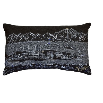 14" X 24" Dark Gray And White Lumbar Homer Spit Hometown Pride Wool Throw Pillow with Embroidery
