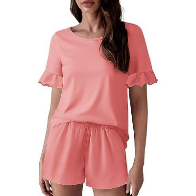 Ekouaer Womens 100% Cotton Pajamas Set Ruffle Sleeves Top and Short Soft Sleepwear 2 Piece Lounge Set with Pockets