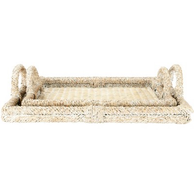 Storied Home Decorative Rattan Trays with Handles & Whitewashed Finish (Set of 2 Sizes)